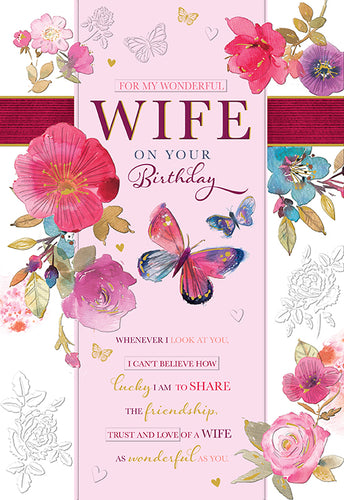Wife Birthday Card - Classic Butterfly & Flowers Design
