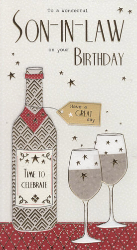 Son in Law Birthday Card - Wine Bottle & Glasses Design